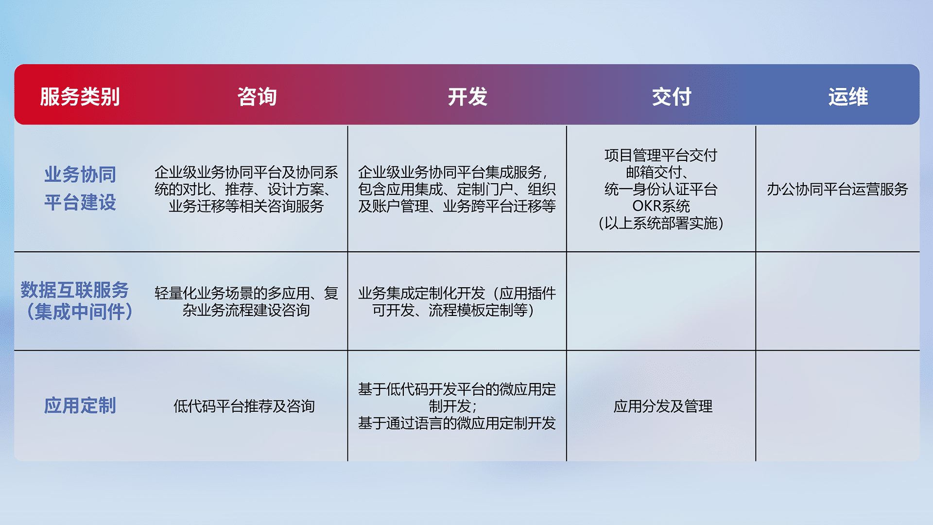 针对钉钉、、企微、、、IDaas等平台级产品提供产品的规划、、方案、、、、交付、、、定制化开发等服务,,实现如统一协同办公、、智能客户服务、、、混合会议管理、、智能数据查询、、、等业务场景,,实现数字化转型。。