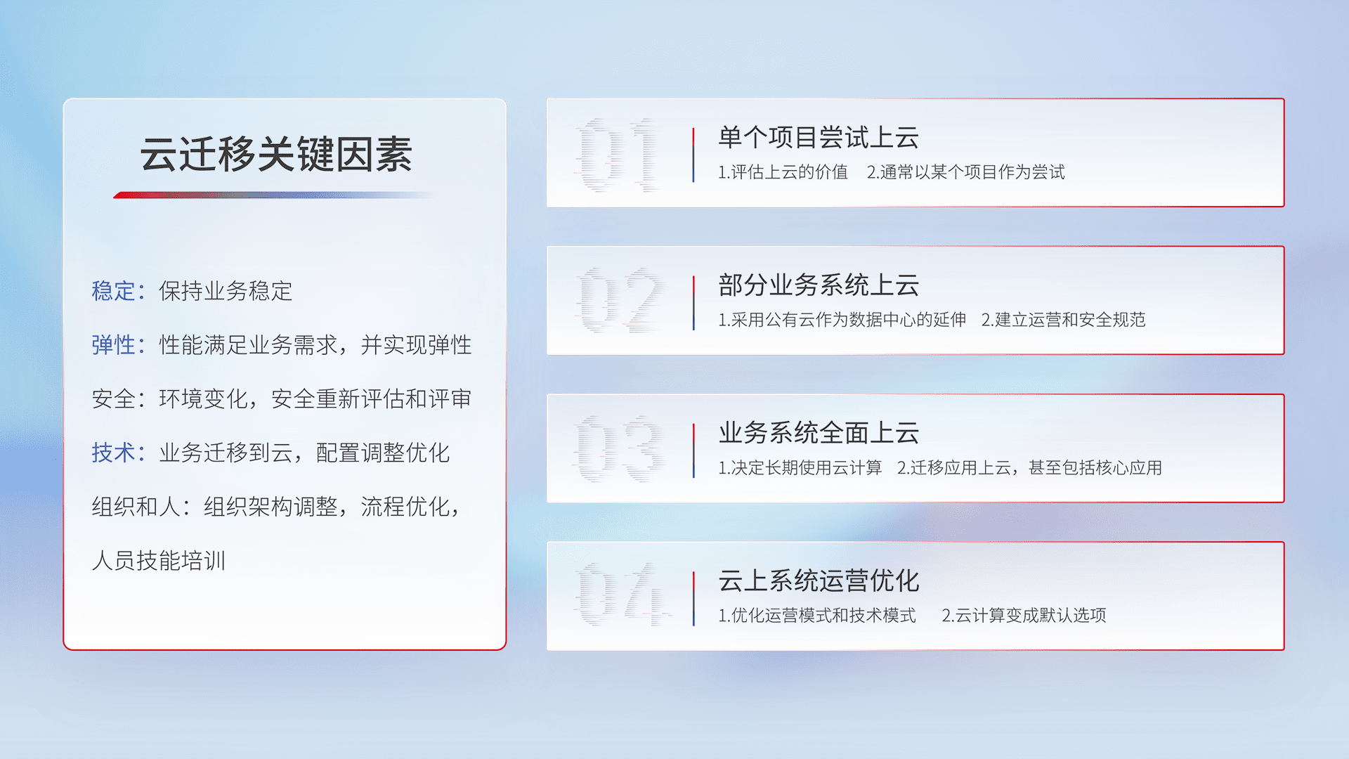 结合实际业务,,,从规划设计、、、云平台选型、、云原生改造、、、数据迁移、、集成交付,,迁移全过程为客户识别最佳上云路径,,,做好风险识别管理,,,设计网络架构、、、、身份权限、、安全审计合规、、、、操作审计、、、日志审计、、监控告警策略、、多站点容灾设计等,,对云上基础设施进行整体规划,,,提升IT治理水平,,,,以满足弹性、、、、高可用、、高性能的需求。。。